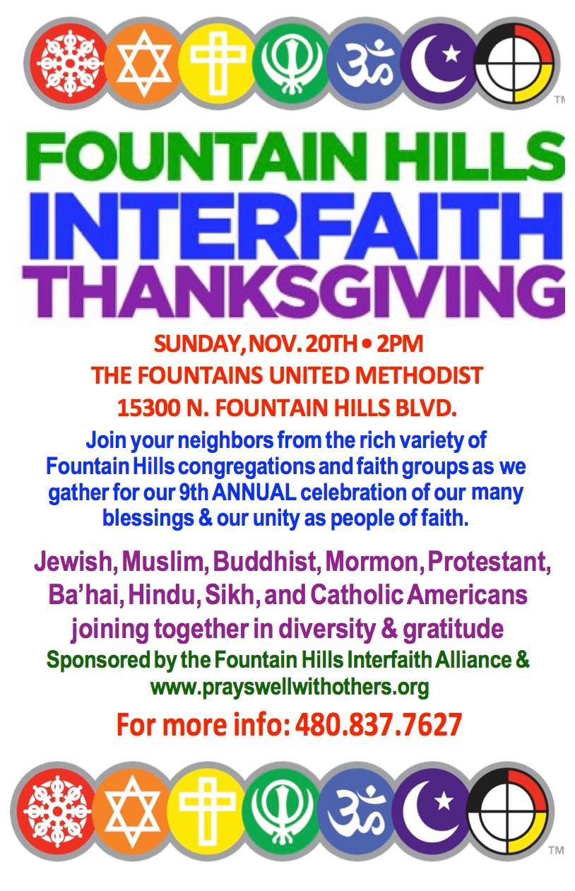 Please join us on Sunday afternoon at 2:00 p.m. at the Fountains United Methodist Church along with your neighbors from a rich variety of Fountain Hills congregations and faith groups as we gather for our 9th ANNUAL celebrations of our many faith blessing & our unity as people of faith.